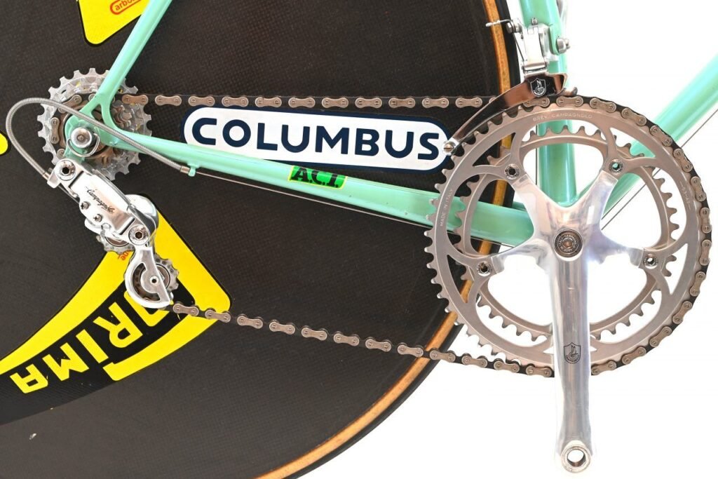 This Bicycle saw competition use by Team MG Maglificio in 1992 , being one of the first time trial racing machines in cycling history. Professional cycling marked the beginning of the TT hi-tech equipment era and this is the best example of Bianchi‘s technology at it’s peak performance.
