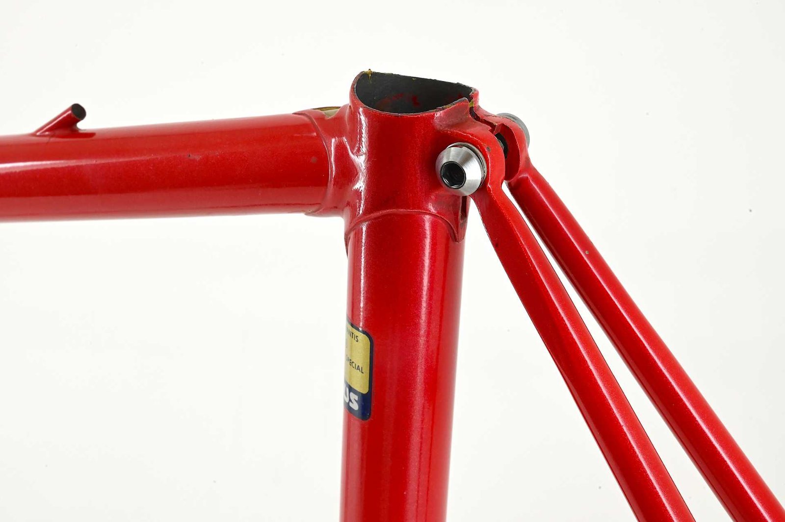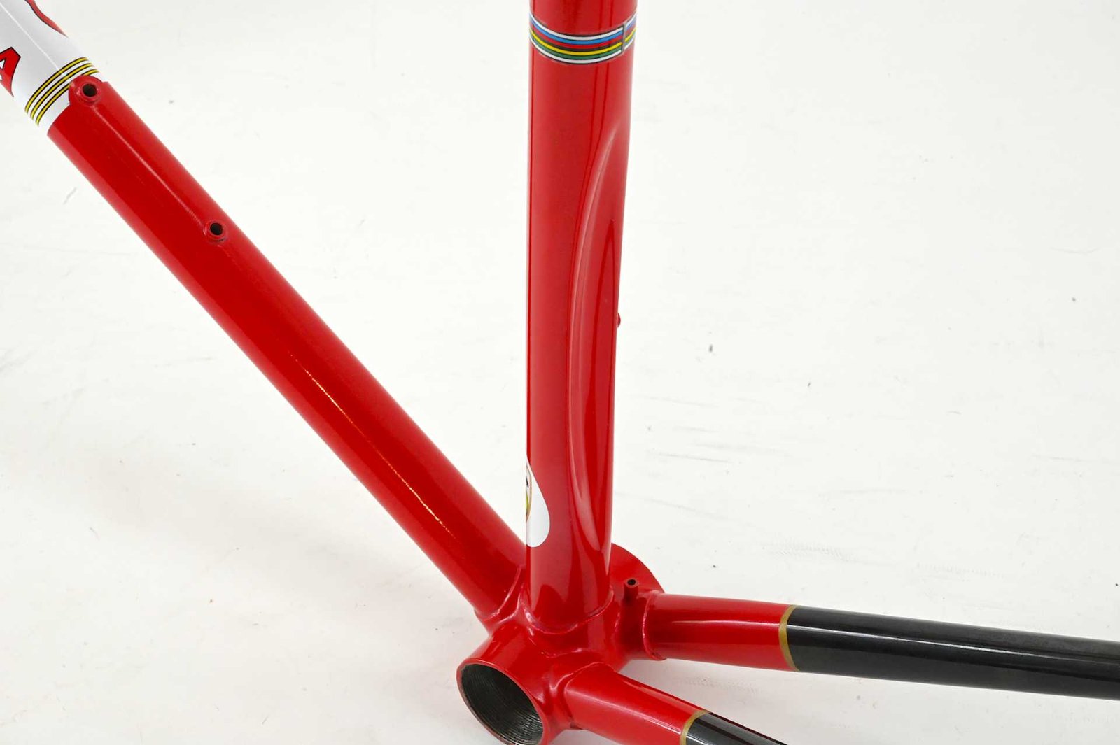 This frame is an example of this company’s great contribution to golden era of frame building, beautiful lugs and pantos combined with this clean red colour and deep black chrome in the back and on the fork makes this frame an absolutely unique piece of art.